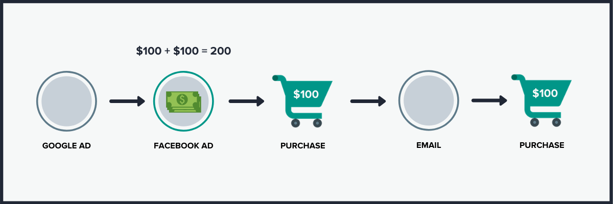 Last-click attribution - also available in Glew - assigns credit for a sale to the channel of the customer’s last click prior to purchasing. (This applies to web orders only for most ecommerce and analytics platforms. However, for Shopify users, Glew is able to default to Shopify’s order source for non-web orders like marketplaces, retail point of sale, Recharge or draft orders.) EXAMPLE: A customer visits a website via Google Ads, then sees an ad on Facebook before making a purchase. Under last-click attribution, Facebook would get credit for that sale. If they come back a month later and make another purchase after clicking on an email campaign, that second purchase would be attributed to email, since that was their last click prior to purchasing.